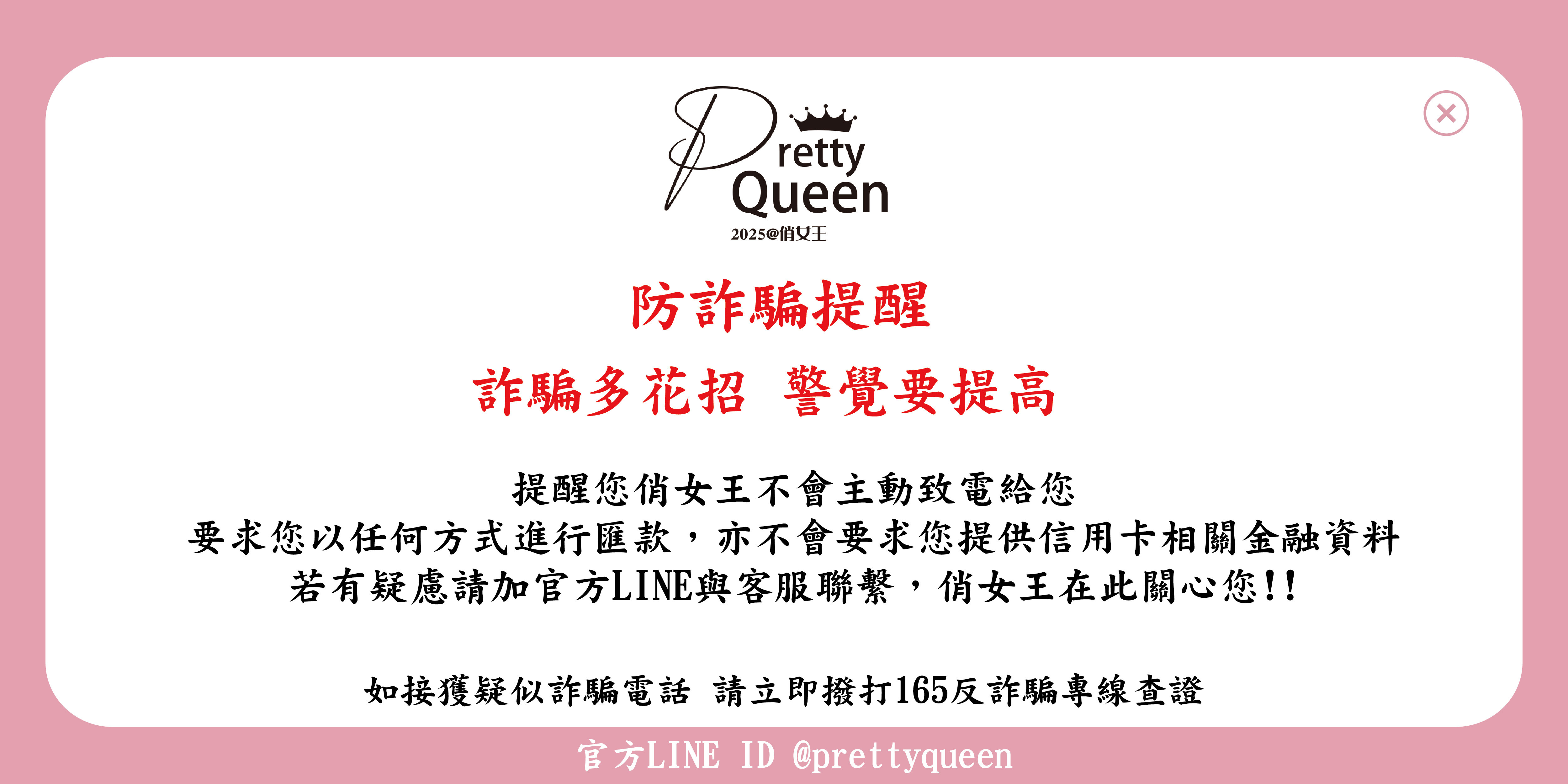 如果您接到相關電話或簡訊,請提高警覺,切勿輕信不明來電指示,若有疑慮,敬請於第一時間聯繫 俏女王 或撥打警政署 165 反詐騙專線進行確認。